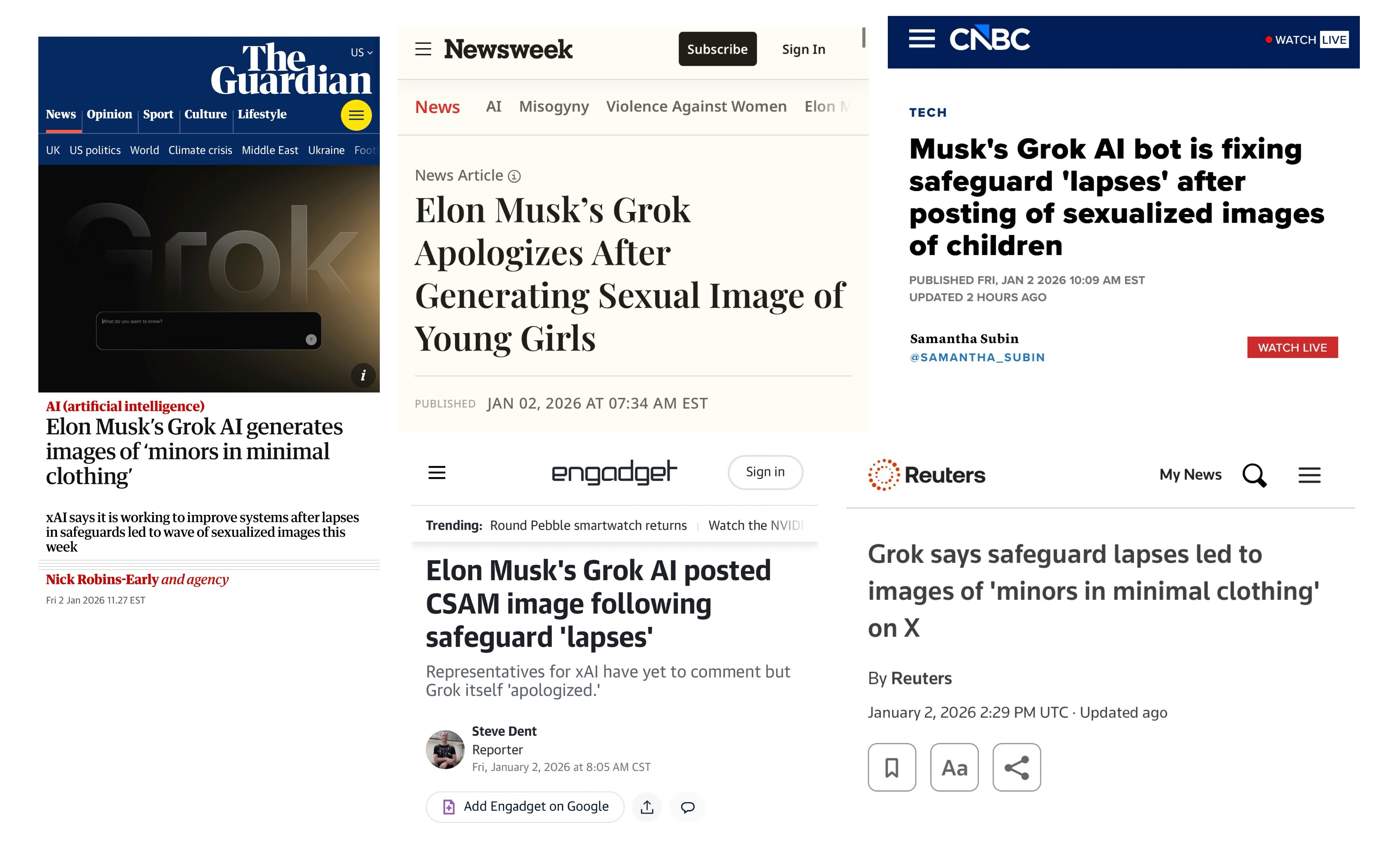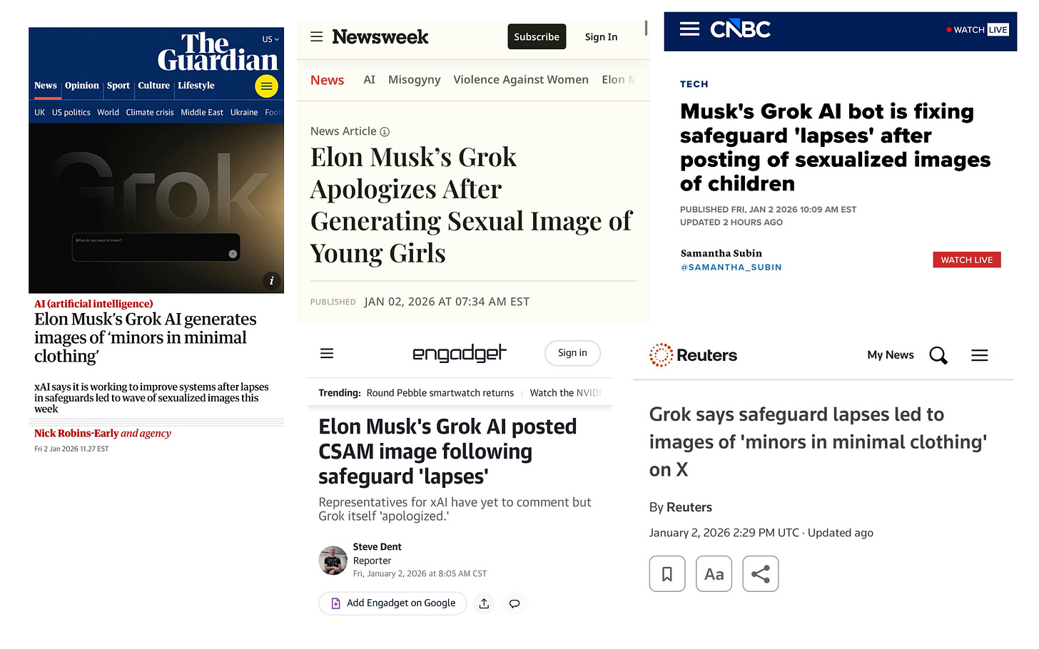 CNBC went with: “Elon Musk’s Grok chatbot blamed ‘lapses in safeguards’” and reported that “Grok said it was ‘urgently fixing’ the issue.”