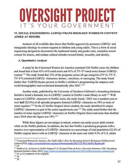 This is how the document functions overall. It’s designed to produce quotable claims and scary numbers that can move through a pipeline: report to press coverage to Senate hearing to congressional record. At each stage, the claims get further from their source material. By the time a senator says “almost half” of Netflix children’s shows contain LGBTQ content, no one in the hearing room is asking about methodology or classification schemes. The number has traveled far enough that it sounds like fact.