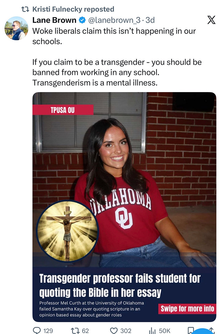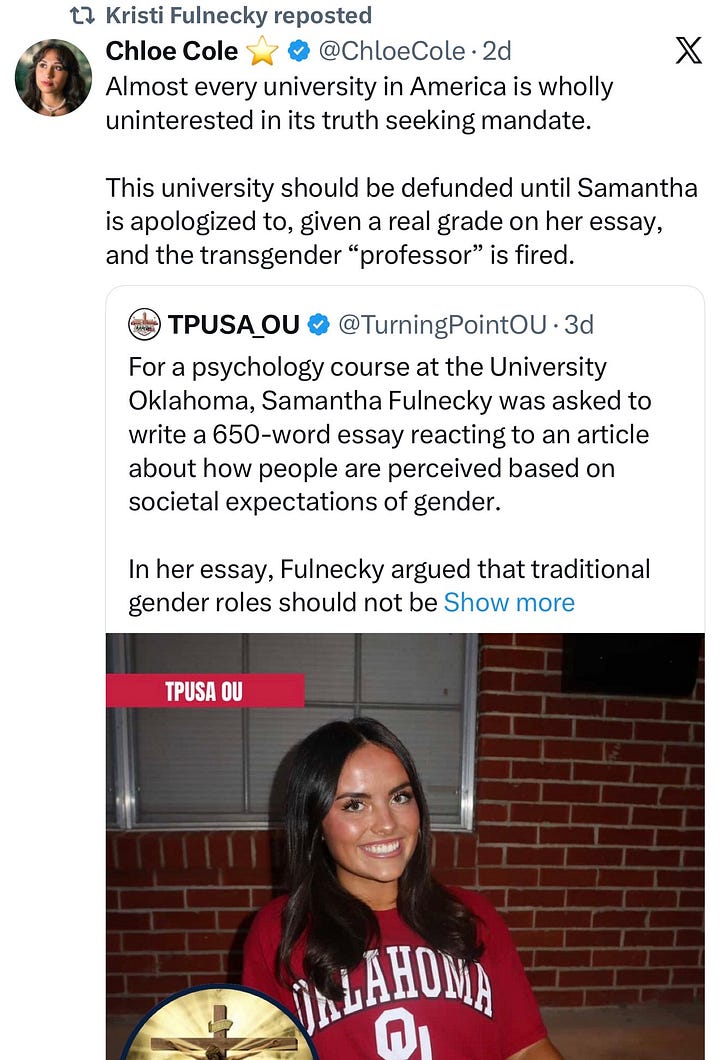 By now you may have seen the story making the rounds. It’s about a University of Oklahoma student named Samantha Fulnecky who received a zero on a psychology essay, filed a discrimination complaint, and got her trans graduate instructor placed on administrative leave. Conservative media has framed this as religious persecution: a brave Christian student punished for citing the Bible. The governor of Oklahoma has weighed in. Libs of TikTok has amplified it to hundreds of thousands of people. Turning Point USA is demanding the instructor be fired.
