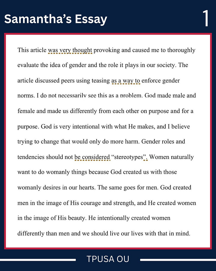 This is not a good essay. Not because of the religious content — you can absolutely bring religious perspectives into academic work — but because she just… didn’t do the assignment. A reaction paper is supposed to react to something. Fulnecky barely acknowledged the source material existed before launching into a position statement that would have worked just as well (or poorly) for any article tangentially related to gender.