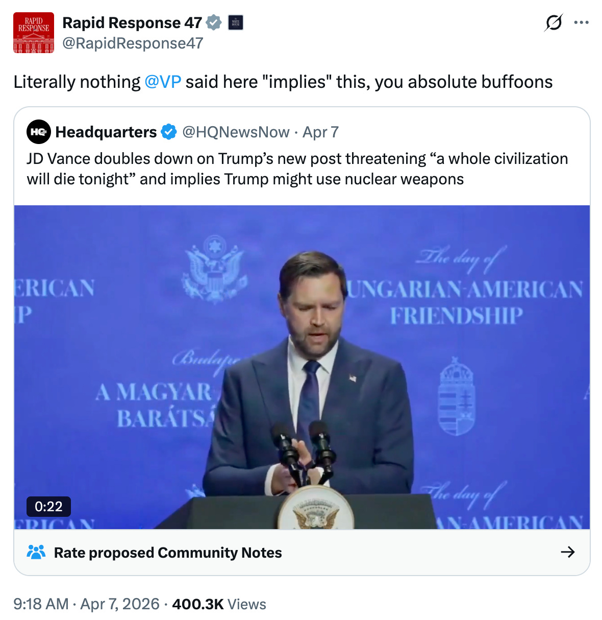 On April 7, at a press conference in Budapest with Viktor Orban, Vance warned that the United States had “tools in our toolkit that we so far haven’t decided to use” against Iran, and that the president “will decide to use them if the Iranians don’t change their course of conduct.” He said this the same day Trump was on Truth Social threatening that “a whole civilization will die tonight.” The “tools in our toolkit” line (which did not, to be clear, specify what kind of tools) was alarming enough that the White House had to post a rebuttal on X that read, “Literally nothing [Vance] said here implies this, you absolute buffoons.”