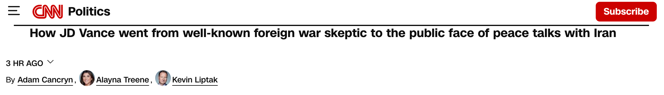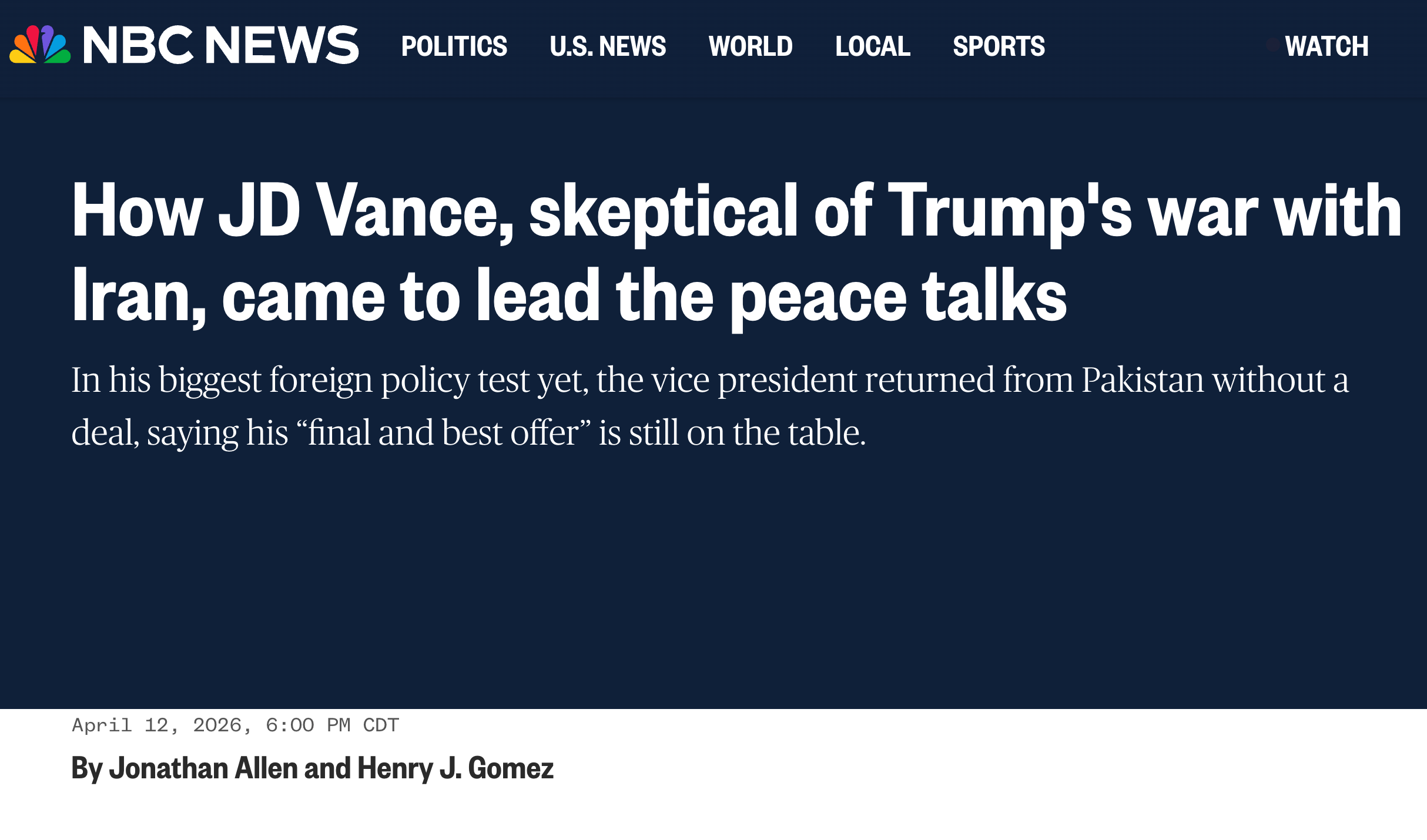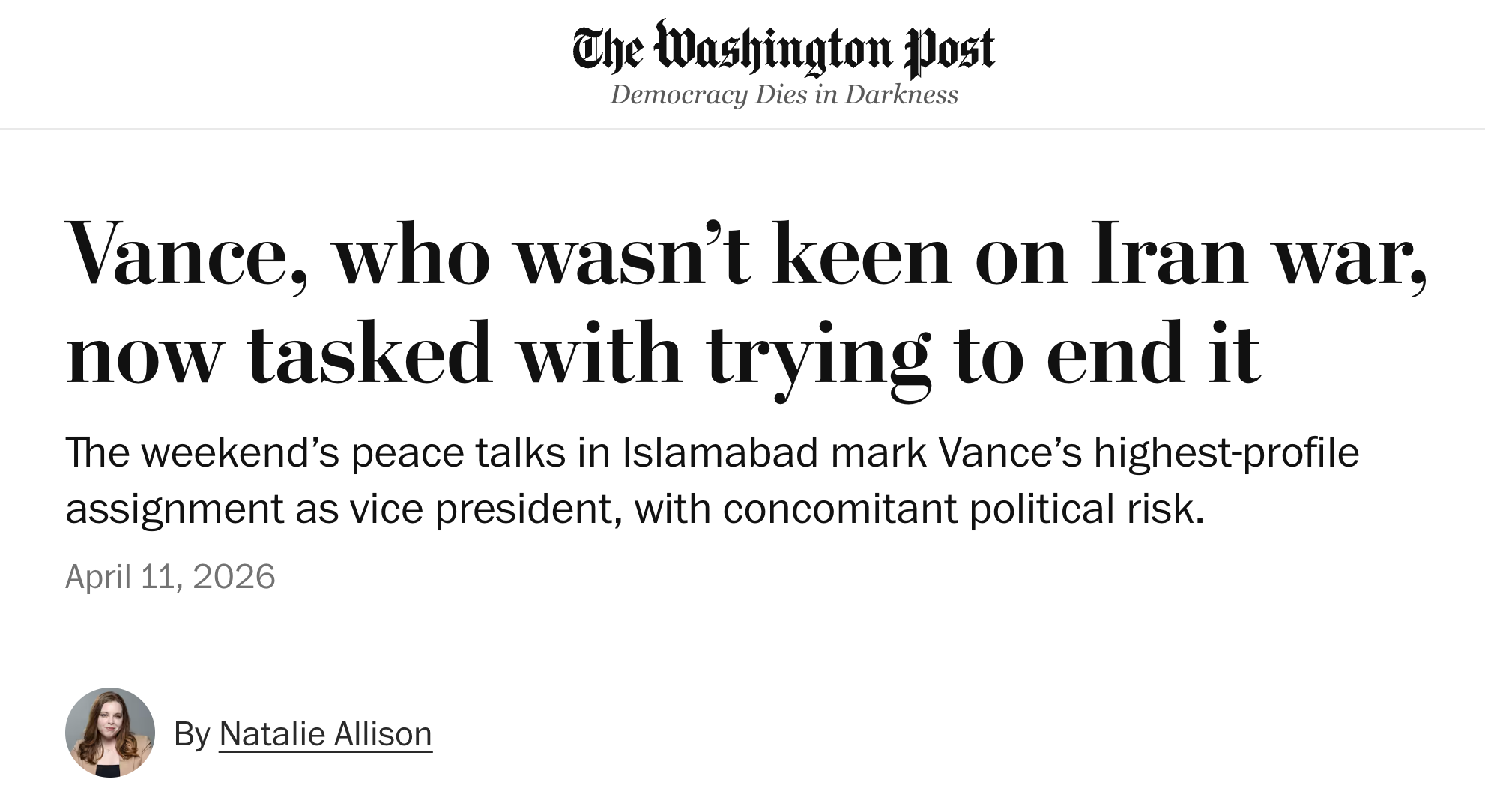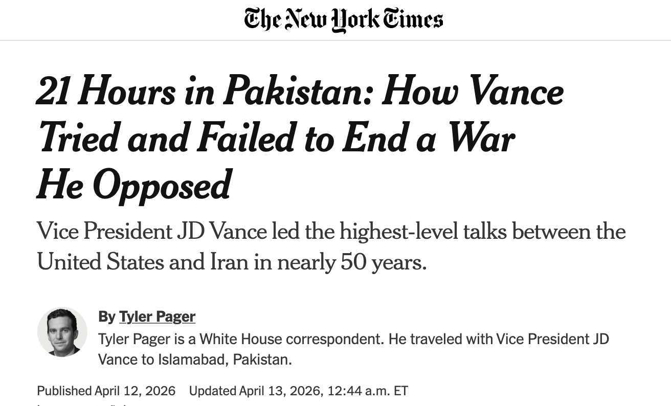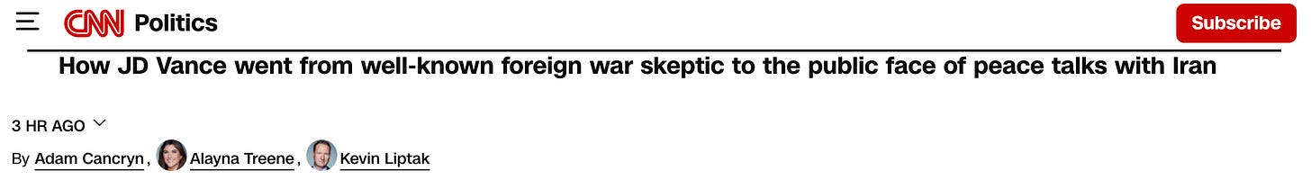 Tyler Pager wrote in the New York Times that JD Vance “tried and failed to end a war he opposed.” Natalie Allison in the Washington Post called him the administration’s “foremost war skeptic.” NBC News went with “How JD Vance, skeptical of Trump’s war with Iran, came to lead the peace talks.” CNN headlined its story “How JD Vance went from well-known foreign war skeptic to the public face of peace talks with Iran.” Politico, back in March, reported that unnamed administration officials had described Vance as the “skeptical” voice in the White House on Iran strikes.