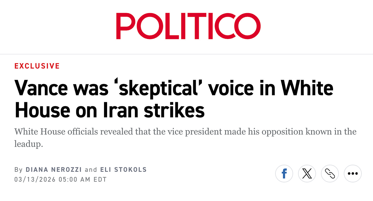 And four days later, Natalie Allison in the Washington Post described JD Vance as “the administration’s foremost war skeptic.”