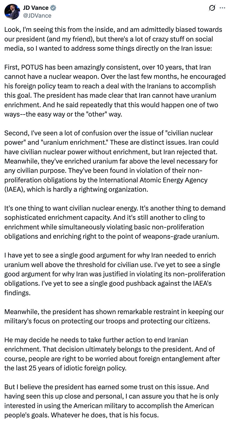 Remarkable restraint. Those are his actual words. In the same thread, he added: “People are right to be worried about foreign entanglement after the last 25 years of idiotic foreign policy. But I believe the president has earned some trust on this issue.” Many “war skeptic” pieces have been quoting this line as evidence that Vance gave credence to anti-war concerns. The line is actually Vance telling the skeptics to sit down and trust Trump. The press has spent a year quoting his actual words accurately and describing them wrong.