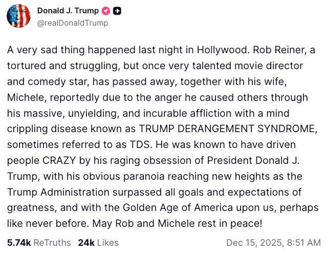 “A very sad thing happened last night in Hollywood. Rob Reiner, a tortured and struggling, but once very talented movie director and comedy star, has passed away, together with his wife, Michele, reportedly due to the anger he caused others through his massive, unyielding, and incurable affliction with a mind crippling disease known as TRUMP DERANGEMENT SYNDROME, sometimes referred to as TDS. He was known to have driven people CRAZY by his raging obsession of President Donald J. Trump, with his obvious paranoia reaching new heights as the Trump Administration surpassed all goals and expectations of greatness, and with the Golden Age of America upon us, perhaps like never before. May Rob and Michele rest in peace!”