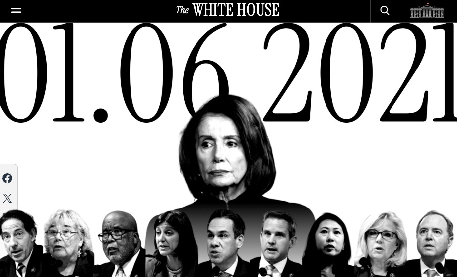 The page opens with sprawling images of Nancy Pelosi and members of the January 6 Select Committee. It describes the roughly 1,600 people charged with federal crimes that day as “patriotic Americans” who were “unfairly targeted, overcharged, and used as political examples.” It refers to those convicted of seditious conspiracy, a charge requiring proof of a plot to overthrow the government, as “mere trespassers or peaceful protesters.”