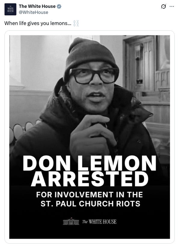 And then came the victory lap. The official White House account posted a photo of Lemon with the text “DON LEMON ARRESTED FOR INVOLVEMENT IN THE ST. PAUL CHURCH RIOTS” and the caption “When life gives you lemons...” followed by a chains emoji.
