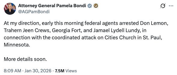 Attorney General Pam Bondi announced the arrests on X: “At my direction, early this morning federal agents arrested Don Lemon, Trahern Jeen Crews, Georgia Fort, and Jamael Lydell Lundy, in connection with the coordinated attack on Cities Church in St. Paul, Minnesota.”