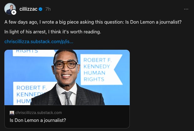 Cillizza’s piece conflates two very different things. There’s Don Lemon’s overall body of work: his YouTube show, his Substack, his social media presence, his obvious contempt for Donald Trump. And then there’s what Don Lemon did on January 18, which was show up to a story, film it, and talk to the people involved.