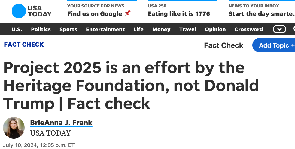 In July 2024, someone on social media wrote that “Trump has made his authoritarian intentions quite clear with his Project 2025 plan.” USA Today’s fact-checkers rated the statement “false,” with the headline: “Project 2025 is an effort by the Heritage Foundation, not Donald Trump.”