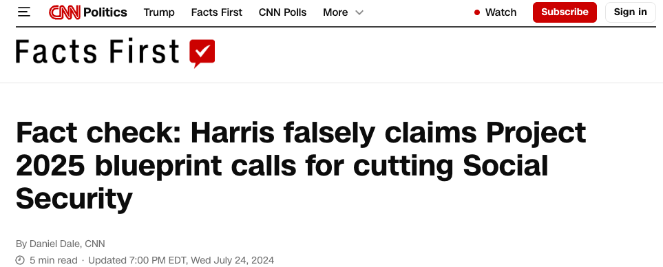 When Harris, at her first campaign rally after becoming the presumptive nominee, said that Project 2025 showed Trump “intends to cut Social Security and Medicare,” CNN’s fact-checker Daniel Dale wrote that this was “false” because “the Project 2025 document does not show that Trump intends to cut Social Security.” Which tells you something about how this worked: because the document wasn’t literally authored by Trump, claims about what Trump “intends” to do based on it were deemed inaccurate.