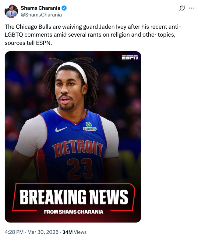 Part of how this became a culture war flashpoint so quickly comes down to how the news broke. The Bulls’ official statement was one sentence: the team “has waived guard Jaden Ivey due to conduct detrimental to the team.” No specifics. But ESPN’s Shams Charania broke it with more detail: “The Chicago Bulls are waiving guard Jaden Ivey after his recent anti-LGBTQ comments amid several rants on religion and other topics.”
