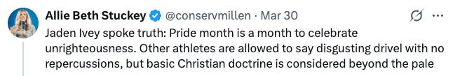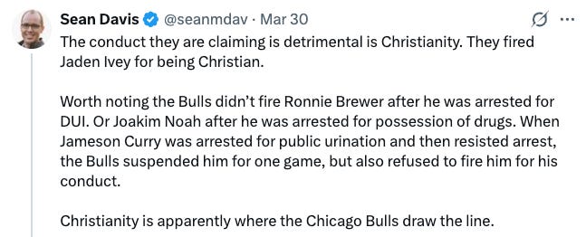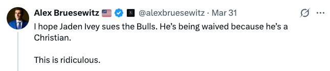 So the “fired for being Christian” narrative doesn’t hold up. But the people pushing it don’t need it to hold up. They need it to be useful. And for about a week, Jaden Ivey is very useful.