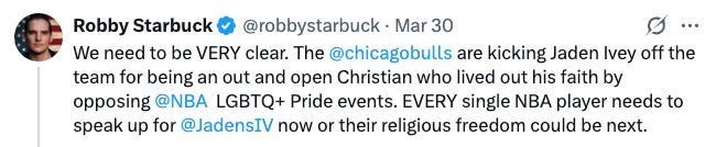 Robby Starbuck posted that “EVERY single NBA player needs to speak up for [Ivey] now or their religious freedom could be next.”