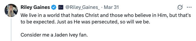 Riley Gaines compared Ivey to Jesus: “We live in a world that hates Christ and those who believe in Him, but that’s to be expected. Just as He was persecuted, so will we be. Consider me a Jaden Ivey fan.”