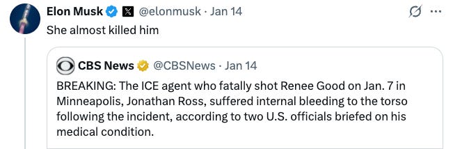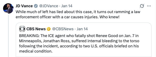 The CBS report doesn’t say Good “rammed” anyone. It doesn’t say she “almost killed” Ross. It says Ross had “internal bleeding,” a term so vague that CBS’s own senior vice president had to point out it could describe a bruise. But once the story was out, it became raw material. Vance and Musk took the CBS reporting and turned it into confirmation of claims the administration had been making since the day of the shooting.