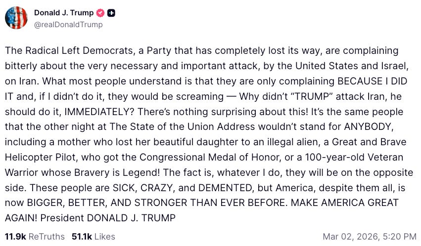 And they’re covering for a justification that barely holds together. Trump claimed Iran’s missiles could “soon reach the American homeland.” His own Defense Intelligence Agency’s 2025 assessment said that capability was a decade away at the earliest. He claimed he’d “obliterated” Iran’s nuclear program in June 2025. Eight months later, the threat was somehow urgent enough for a full-scale war. Every second spent on “Iran is bad, but” is a second not spent on “the president’s stated justification contradicts his own intelligence agencies.” The whole point is to make sure nobody talks about the substance.