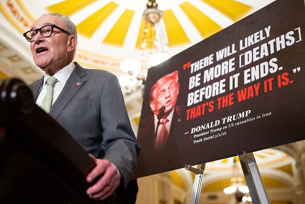 Schumer, on February 28: “When I talked to Secretary Rubio, I implored him to be straight with Congress and the American people about the objectives of these strikes and what comes next. Iran must never be allowed to attain a nuclear weapon, but the American people do not want another endless and costly war in the Middle East when there are so many problems at home.”