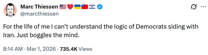 Marc Thiessen, the former chief speechwriter for George W. Bush, posted on X this week. He just can’t understand the logic, he wrote, of Democrats “siding with Iran.”